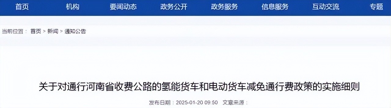 河南省交通厅发布氢车免通行费实施细则。2025年1月25日0时至2025年12月31日24时,对在河南省综合交通运输管理服务平台运政系统登记(新增车辆登记完成10个工作日后可享受优惠政策)的氢燃料电池货车免收通行费。