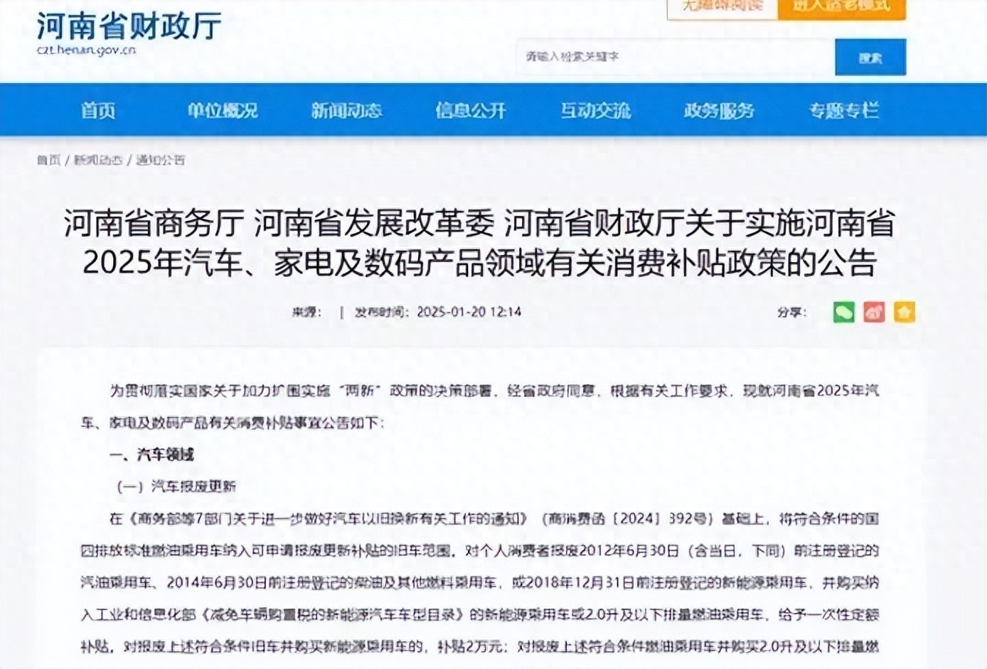 1月20日,河南省商务厅、省发展改革委及省财政厅联合发布关于实施河南省2025年汽车、家电及数码产品领域有关消费补贴政策的公告,全面启动“以旧换新”补贴活动。